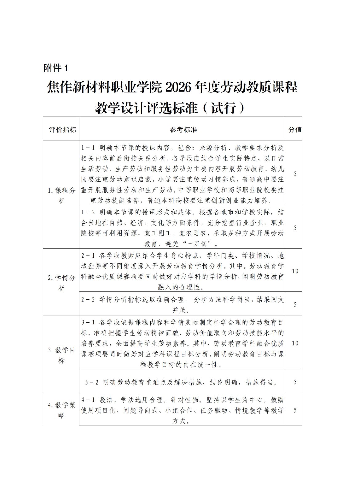 附件: 1. 焦作新材料职业学院2026年度劳动教育优质课教学设计评分标准(试行)