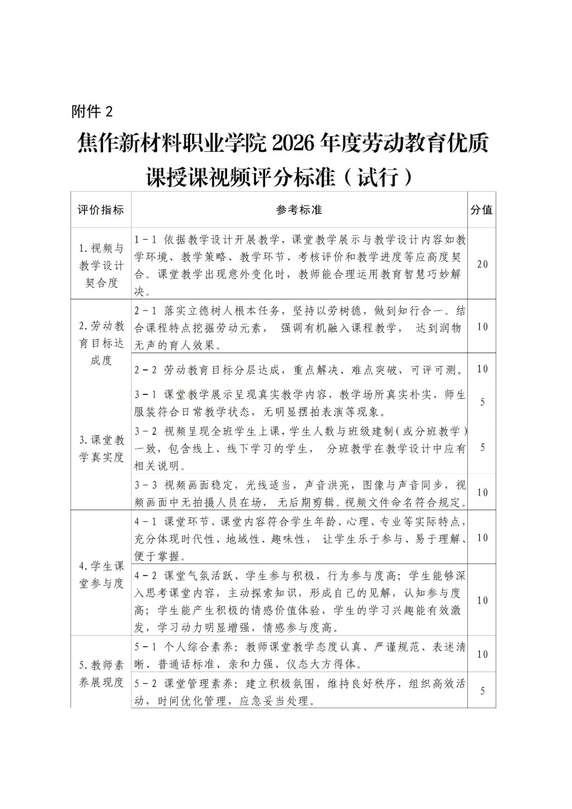 2. 焦作新材料职业学院2026年度劳动教育优质课授课视频评分标准(试行)